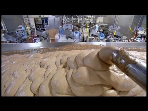 How It’s Made showed fish sticks. They start with a giant gray brick of ground cod that gets squeezed through a die into flat planks. Yummy!