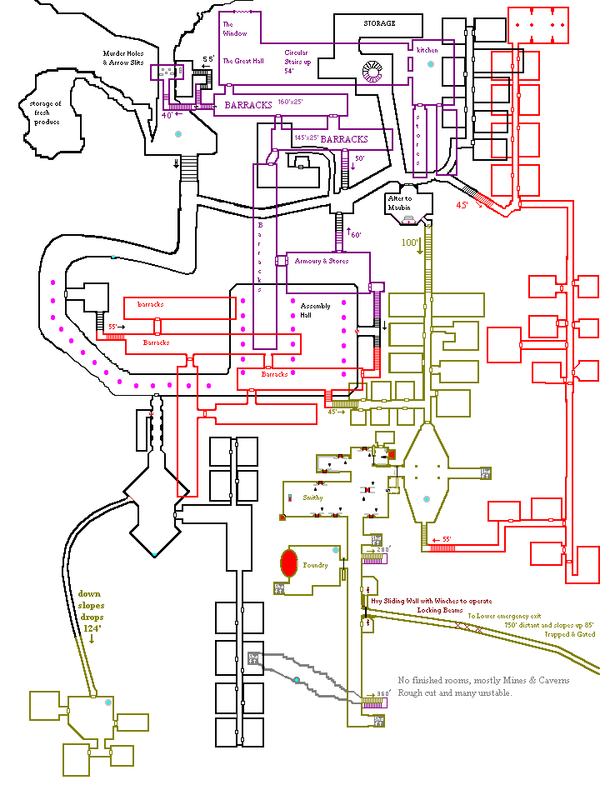 The armory and foundry are located on the lowest level (olive colored). There are shafts going deep with well built and maintained hoists in the lowest level. She verifies the lower escape route with a heavy sliding wall and gates. Unlike Goblins all the murder holes and traps seem to be oriented to the entrances and exit.