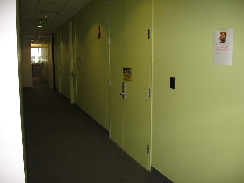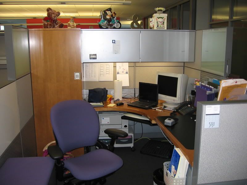 And here is my new cube, so you can visualize me typing away, and a picture of the hideous green hallway on my new floor. When we moved in 5 years ago, all of the floors were painted green. People screamed bloody murder, so they painted swatches on one of the floors and had people vote. The floors who voted got a pretty [del]ugly[/del] periwinkle blue, and the apathetic floors kept the green. A fitting punishment for voter apathy, dontcha think? I think they liked the green because they match the red-eyed gators on the chairs in the lunchroom.