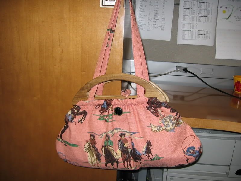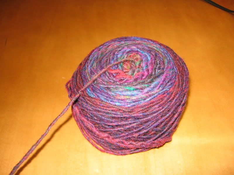 I finally bought yarn last night for my international gift exchanges. Boring navy yarn for the purse and purty yarn for the scarf. While I’m at it, here is a picture of one of my new knitting bags.