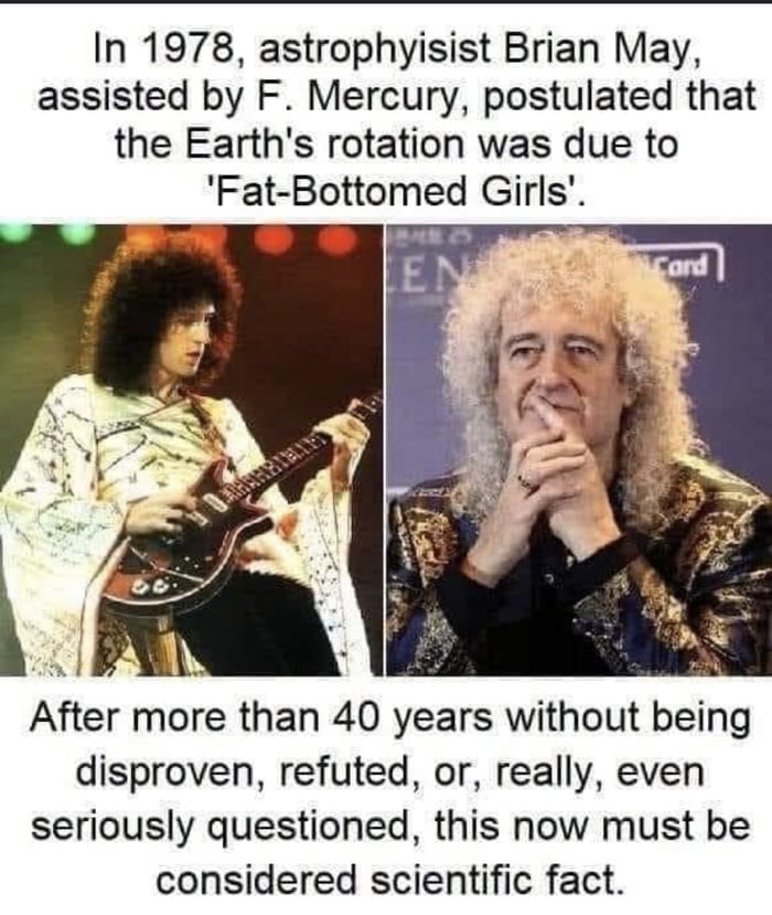 In 1978 astrophysicist Brian May postulated that the Earth’s rotation was due to “Fat Bottomed Girls.” After more than 40 years without being disproven, refuted, or really even seriously questioned, this must now be considered scientific fact.