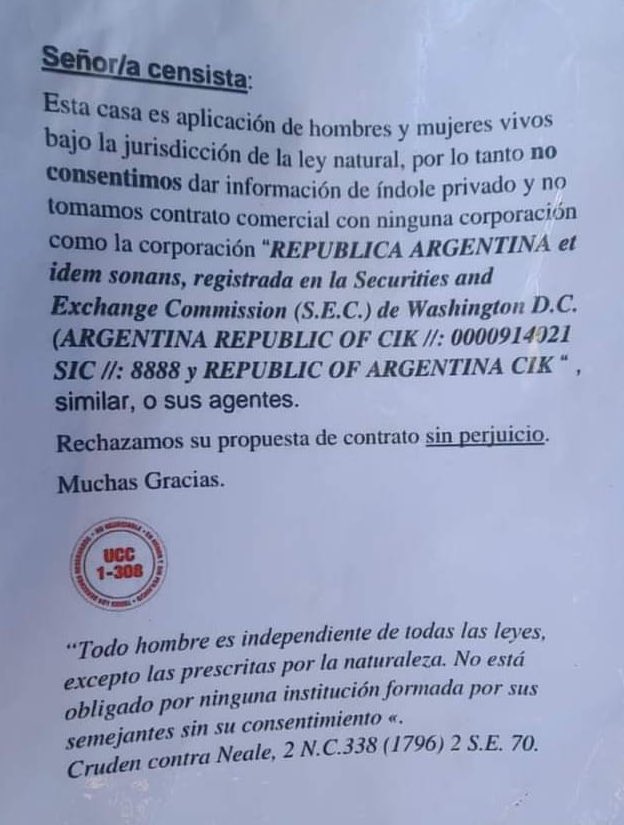 This house is the application of living men and women under the jurisdiction of natural law, therefore we do not consent to give information of a private nature and we do not enter into a commercial contract with any corporation such as the corporation “REPUBLICA ARGENTINA et idem sonans, registered in the Securities and