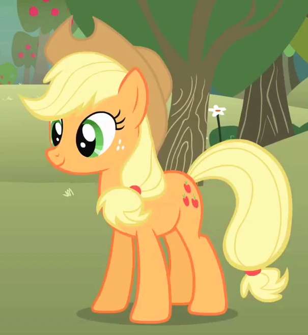 We happen to have a little pony of our own (a miniature, to be precise) named Firefly who bears a resemblance to Apple Jack. Heh–looking at the photos, Firefly even has the formless white spots on her face–she almost has a facial marking, but doesn’t, so it’s more like AJ’s freckles. Heh.