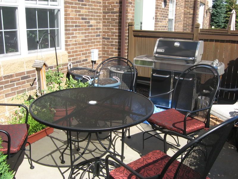 So here’s our breakfast bar where we eat most meal, not just breakfast. If it’s nice out, though, we eat dinner (and sometimes lunch!) on our patio. Note the nice, big Webber grill in the background there. That was one of our first purchases once we had a patio to put it on. It gets used a couple times a week usually, even in the chillier months. We’re serious about our grilling! The patio set is still new (bought during Labor Day sales… yay!) but it’s really nice to have a dining-height table out there instead of the little table we had before.