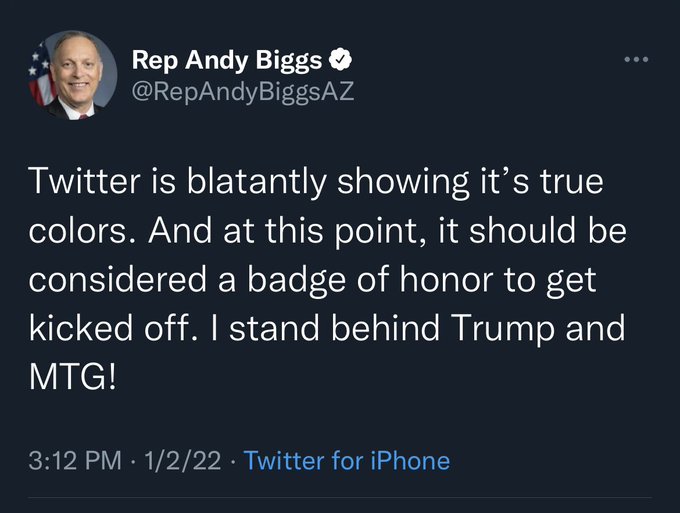 MTG’s personal twitter account has been suspended permanently after multiple short-term suspensions over the last year-or-so, mostly for Covid misinformation. Her official congressional twitter account remains active.