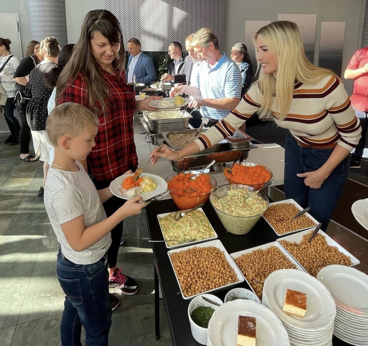 Ivanka allegedly feeding Ukrainian refugees in Poland. Note that there are people serving themselves on her side of the table. It’s self serve, not “Ivanka will serve everybody”. The mom doesn’t have a plate, so it’s totally staged. Her hair isn’t tied back to keep it out of the food, and she isn’t wearing gloves. And why is her hand in that weird position?