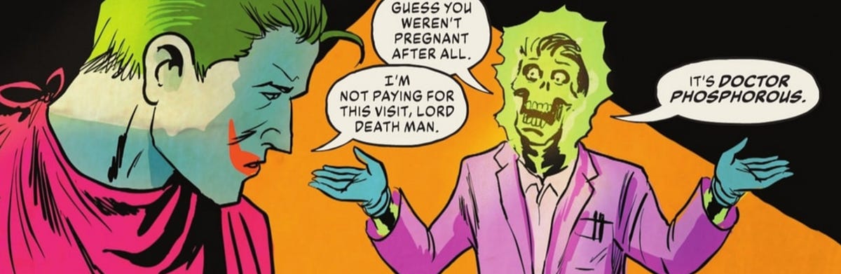 DC Comics recently ran a Silver Age throwback-style comic with a B-story in which Zatanna bewitches the Joker into thinking he’s pregnant before vomiting up a mud golem.