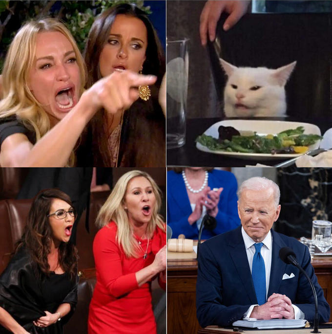 This is analogized with the photos in the lower portion which show pictures from last years SOTU speech in which MTG and Boebert heckled Biden..