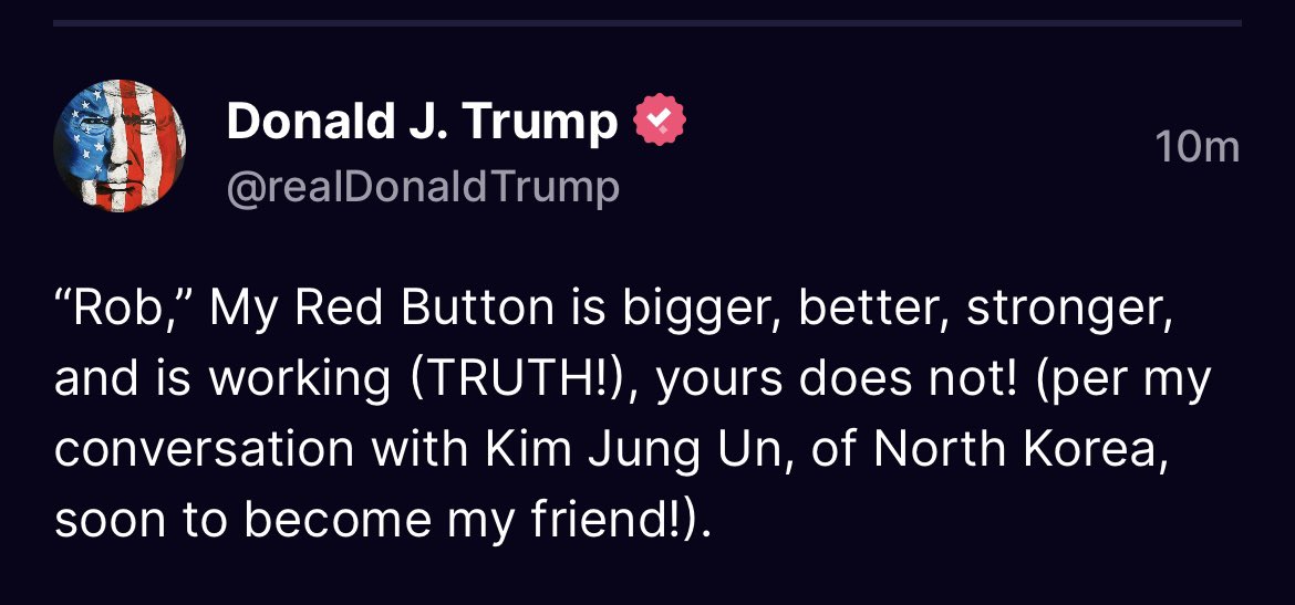 What I find weird is that I have a vague memory of the America-hating fuckstick using the “red button” taunt as a bit of sabre-rattling against Kim Jong Un early in his term, before he fell in love with him.