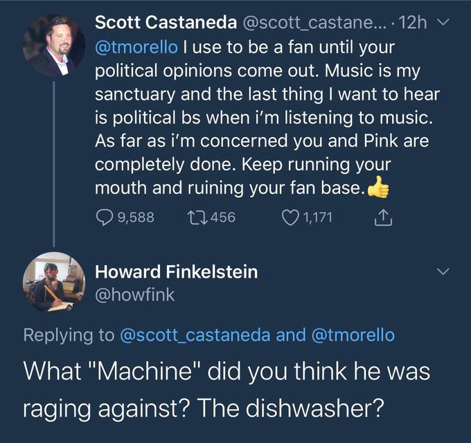 Reminds me of a few years back, my buddies went to Coachella to hear (amongst many things) Roger Waters, who then apparently went on an anti Trump tirade. My buddies then recounted how many people were pissed off and screamed about keeping politics out of music, as if they had never heard Roger Waters or Pink Floyd before, yet paid over 300 bucks to be there.