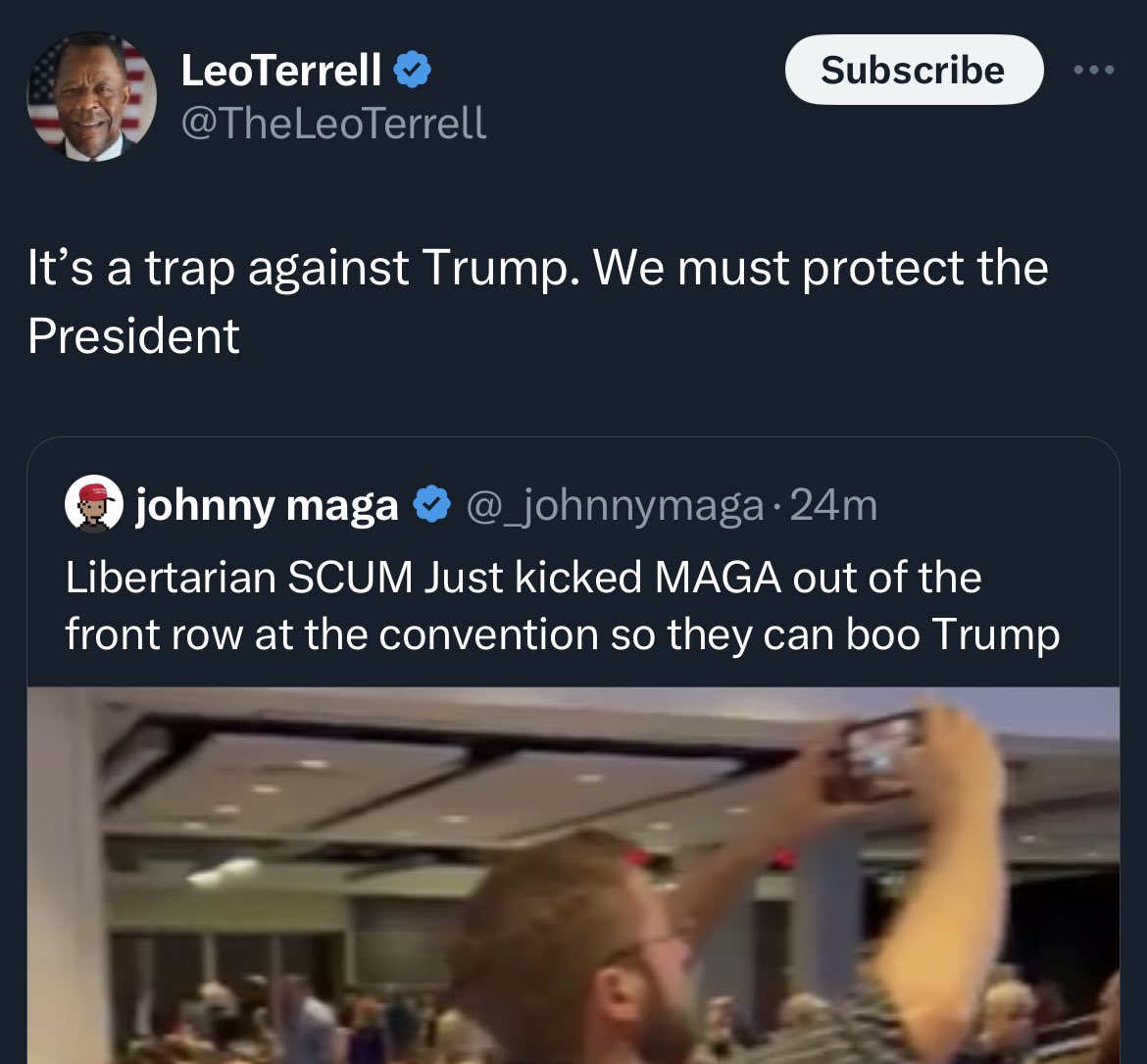It obviously has to be one of: made up accusations about the group itself, claiming democrats infiltrated the conference, claiming libertarians actually love him (and here’s someone holding a “libertarians for trump” sign), or, most likely, all of the above.