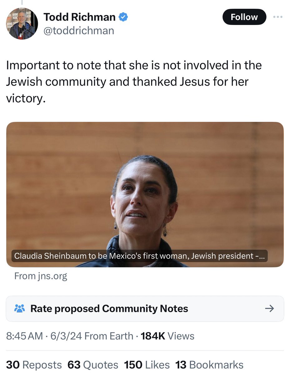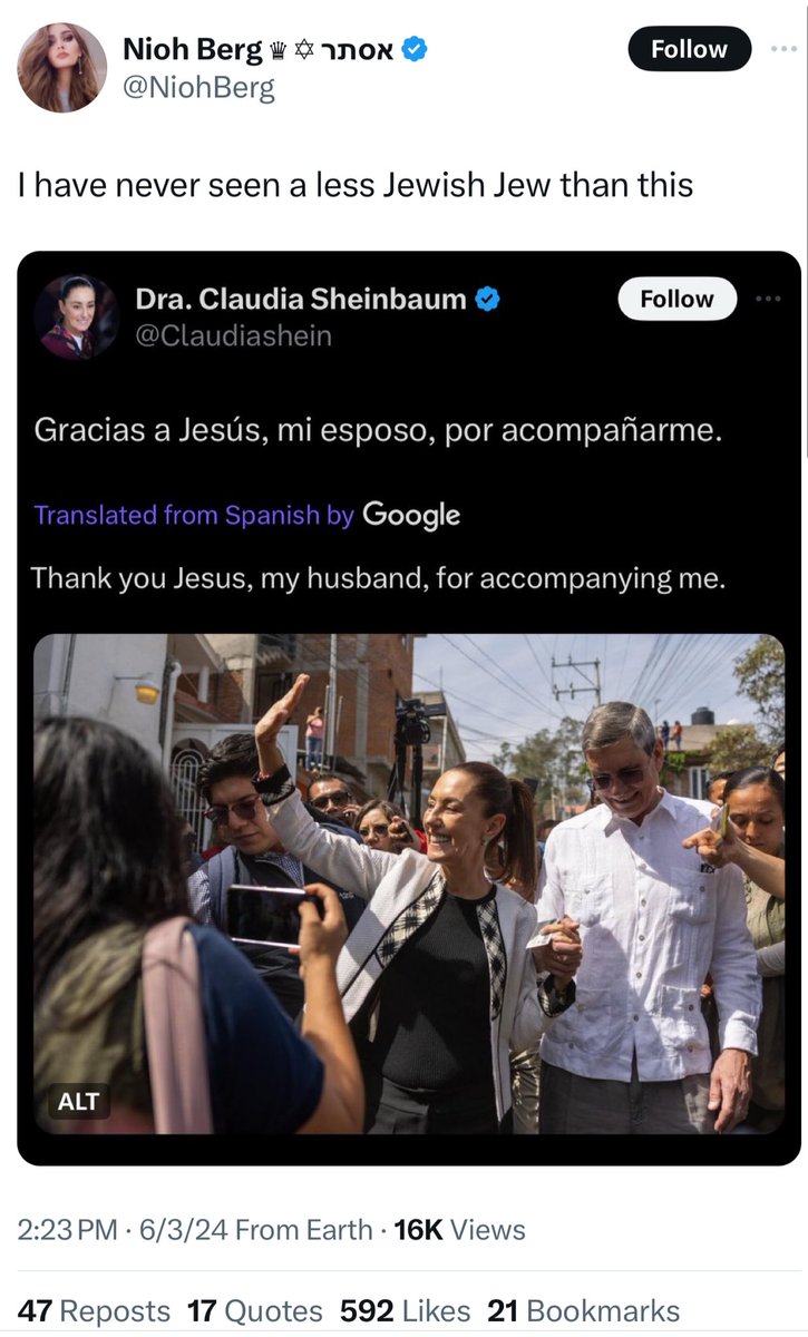 Alt-right Twitter chuds are claiming that the president-elect of Mexico, who is Jewish, must be a fake Jew because she thanked Jesus in a tweet after her election.