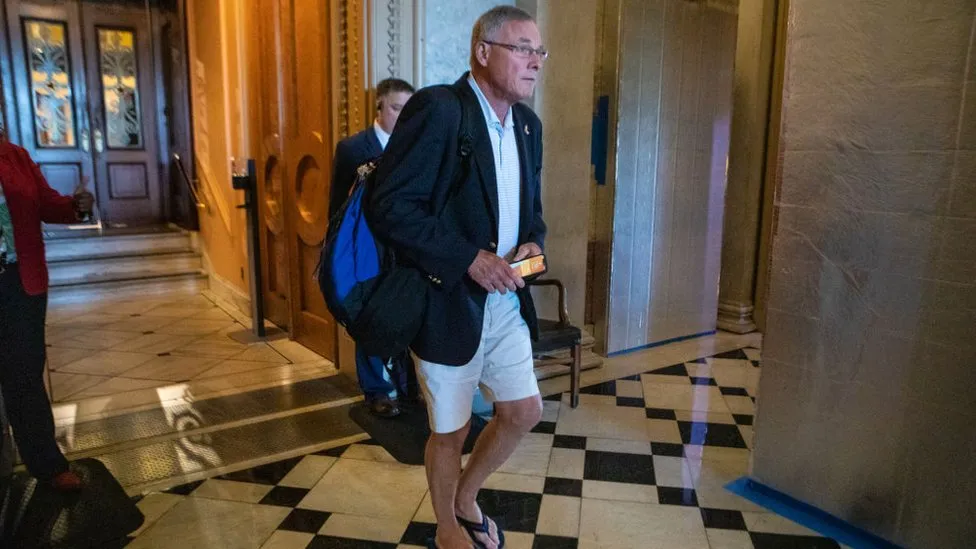 “Senator Richard Burr departs the gallery after a vote, wearing flip flops and shorts on a Saturday in August 2022.”