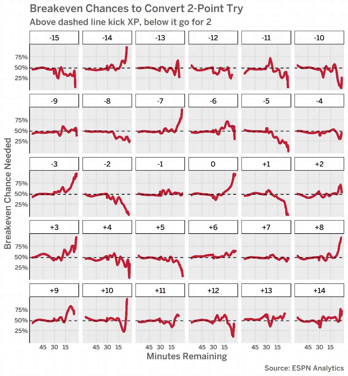 - It’s really the combination of score and time remaining (including timeouts!) that determines whether or not a team should go for two. Note the time specifications within each score breakdown.