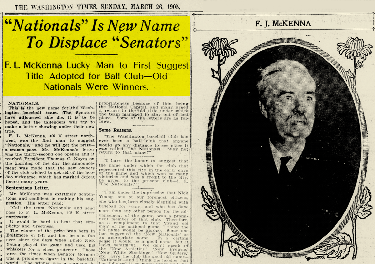 The “Nationals” name—like a lot of team names appropriated by American League clubs—is actually much older. I don’t know whether there was ever an actual “National Club,” but the name comes from the era in which teams were usually associated with gentlemen’s clubs.