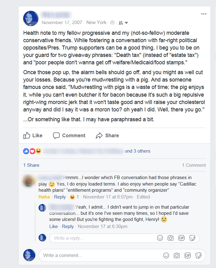 Here’s what it looks like in my now altered timeline. (Link is to an image hosting service, not my own Facebook. You think I’m nuts?! Also, apologies in advance for blatant lefty comments that may offend right-tinged folks of a certain stripe, though I was aiming at a subset.)