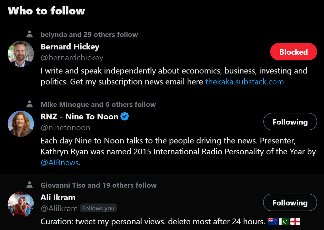 The algorithm is recommending I follow one person that I’ve blocked, and two people I’m already following.