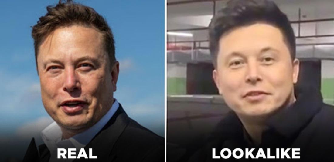The caption writers have done that funny thing whereby they intentionally mix up who’s who. Elon Musk’s the guy on the right and the lookalike’s on the left.