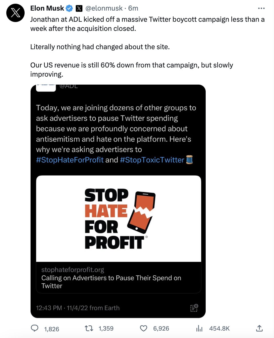 I don’t believe this is an accurate characterization of Musk’s complaint. Musk’s complaint is that the ADL is defaming Twitter by telling advertisers that it is a haven for anti-semitic messaging, and is urging those advertisers to stop advertising on Twitter. This is, of course, bullshit.