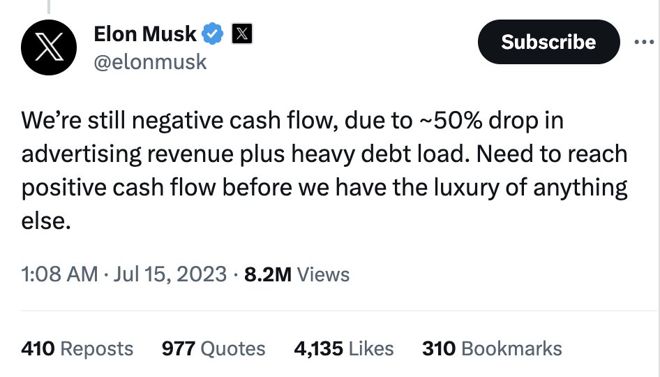 This business of suing the ADL for Twitter’s advertising woes is very reminiscent of the tantrum of a six-year-old and deserves about as much serious attention. It wouldn’t surprise me if it was a drug-induced tantrum. It also reflects Elmo’s proclivities for blaming everyone but himself for his troubles. I suspect it will all be quietly forgotten as quickly as it arose, but if not, this would be a positively Trumpian level of frivolous abuse of the legal system and is the kind of thing that gets lawyers sanctioned and disbarred.