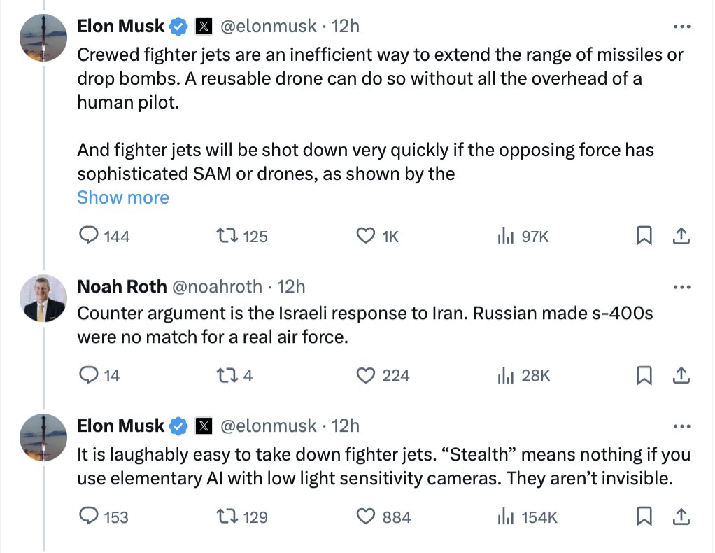 You just know Musk thinks that he’s had an amazing insight that nobody has ever had before. That no one has ever said that manned aircraft are no longer effective.