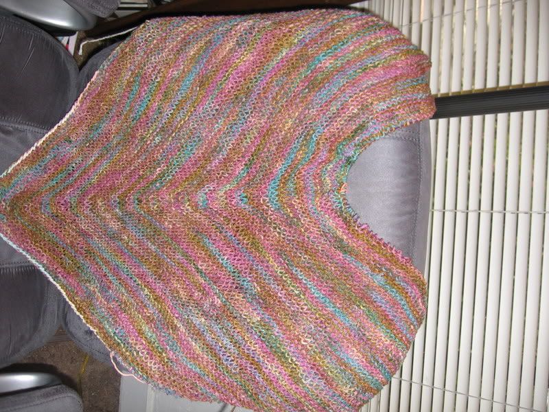 I finally figured out what was slowing my computer down so much that I couldn’t watch DVDs or listen to CDs. Yep, it was Norton. My system runs so fast now! I can’t wait to watch Pride & Prejudice again, and get some serious knitting in. I’ve started the right front of the Lady, so I’m pretending I’m halfway there. I should be able to finish this weekend. Here’s my progress so far. It’s getting rather heavy now, and keeps sliding off my lap.