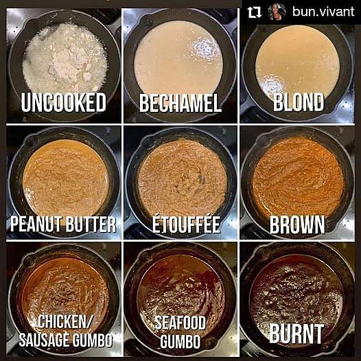 Well, I think he’s saying the roux is “light peanut-butter-colored,” so on the light side of peanut butter roux, not “light, peanut-butter-colored” saying that peanut butter rouxs are light.