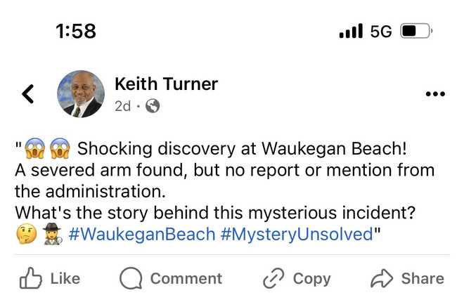 “Alderman Keith Turner at no time contacted the Waukegan Police command staff or anyone within Waukegan City government to ask about this incident before posting the photo of the remains on Facebook. The City did not provide Ald. Turner with the photograph, and he was never given permission to post the photo on his Facebook page. Individual Aldermen are not authorized to speak on behalf of the City, much less for the Police Department. On behalf of the City of Waukegan, I find the posting of an image of this type to be morally disgusting, socially irresponsible, and extremely cruel to the victim’s family. I hope all Waukeganites join me in prayer for the victim of this horrific crime and for the victim’s family.” - Waukegan Mayor Ann Taylor