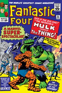 As far as I can recall, Kirby only matched the two up twice – in FF #12 (where I think they interact for one panel) and FF 25-26, which features LONG fight scenes between the two, complete with priceless dialog (“Hey! Leggo! That’s the hand I eat pizza with!”) FF #25 also has the best cover, illustrating the pronounced size difference between the two.