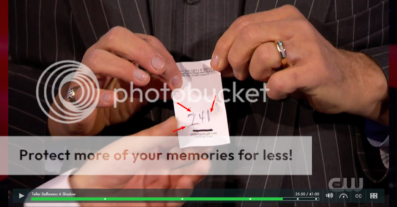 caligulathegod, I’m in agreement with you, he has some sort of printing arrangment to print on the treated paper on his back. It was immediately obvious to me the writing was faint blue, not dark like a sharpie. And I also noticed the note pad wasn’t used for reminding him of the number or showing the audience for comparison. A pencil nub device is plausible, but I’m doubtful that it would repeat so consistently for the duplicate overwrites. Yes, the 2 smears at the top and the bottom, but if he really did overwrite the 1, it should vary more, don’t you think? And the 2 is still in the same location. How to constrain it to write three numbers, evenly spaced, moving over for each number but not moving during the overwrites?