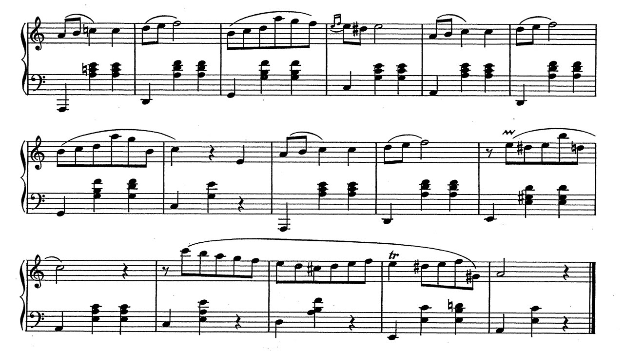 Fur Elise - the main theme is really easy - amateurs love it because the two hands never play simultaneously. However, the B and C sections will be a shock - they are not so easy.
