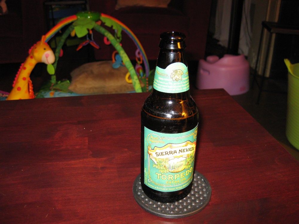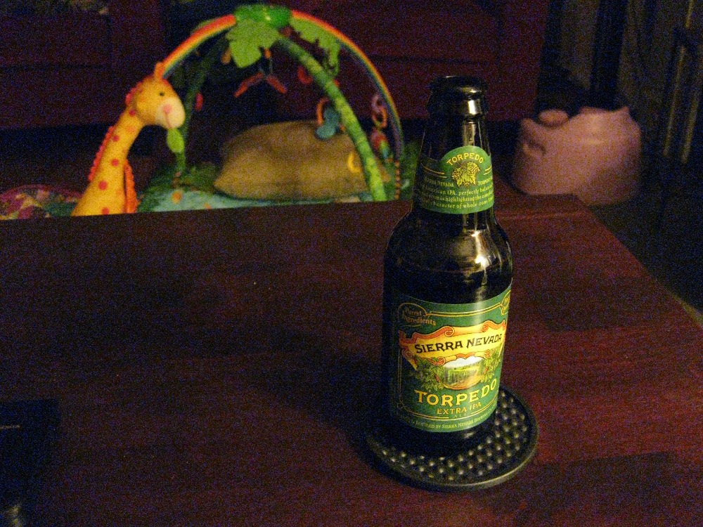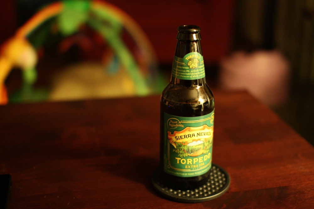 Here’s what the point-and-shoot automatically took. The resolution is adequate, it’s not blurry, you can see plenty of detail. It’s a picture of a beer bottle, and it’s not winning any prizes. It’s also pretty obvious I shot it with a point-and-shoot. I didn’t like the flash overexposure, so I thought I’d also see how well I could do without the flash, and I ended up with this abomination – obviously I had to crank the ISO way up and the results aren’t pretty. Onto the DSLR: first shot. (note: also not winning any prizes, but this picture is about 1000 times prettier than the other two).