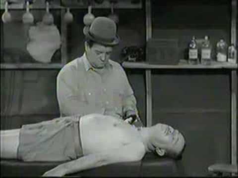 The recording says, “First, sterilize your hands with rubbing alcohol or witch hazel.” Costello asks Abbott which one to choose, and Abbott says, “Oh, just use either.” Costello gets a bottle of ether, which knocks Abbott out.