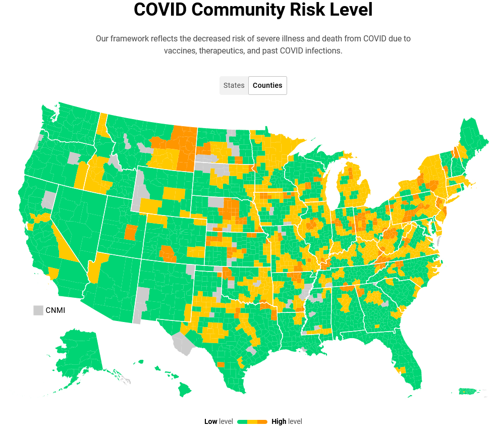 Attached: 1 image Current COVID community risk levels. From covidactnow.org