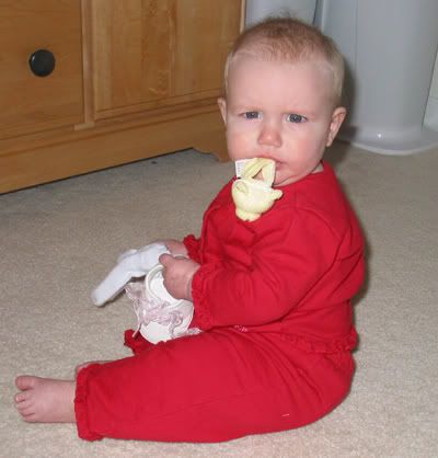 Aubrey will turn 9 months tomorrow. She now has two teeth, bottom center, and can crawl, although she hasn’t figured out “forward” yet, which means she tends to back her silly butt under the entertainment center. She’s been a really easy baby, and we’ve been incredibly lucky parents.