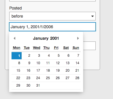 As a workaround you can look in the freehand search field at the top left where a search code is being compiled from what you check off or enter over on the right. But the regular search date interface really ought to be fixed. This is awful.