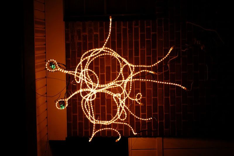 Lest we offend some Higher Beings, we were careful to put our FSM on the other side of the tree from the stained glass Star of David, of course.