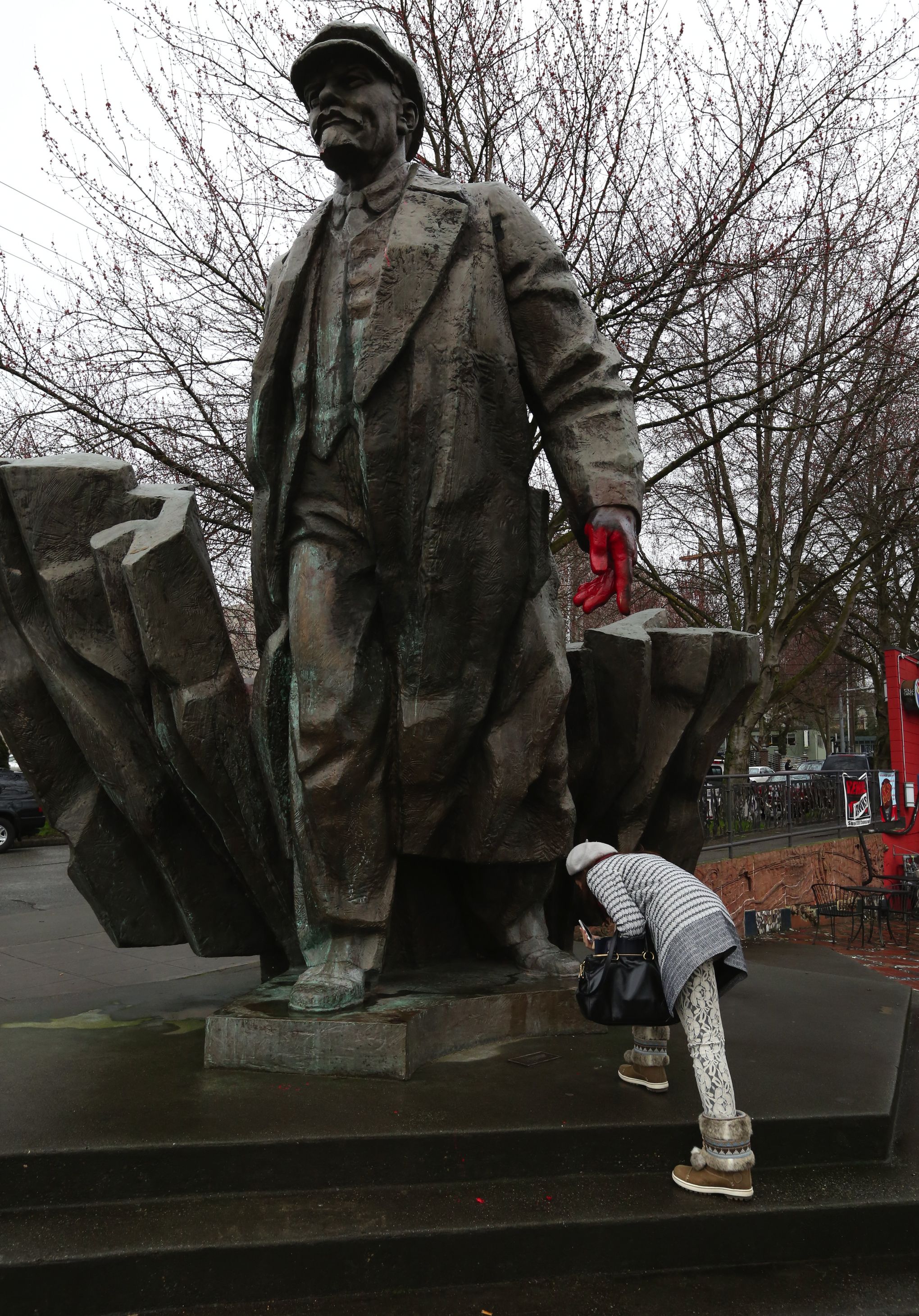 I silently cheer every time someone paints his hands read again. It would be different if there was a prominent feature explaining his evil actions, and I would not support ISIS style destruction. But the painting of his hands red is mostly non-destructive and gets the message across very clearly.