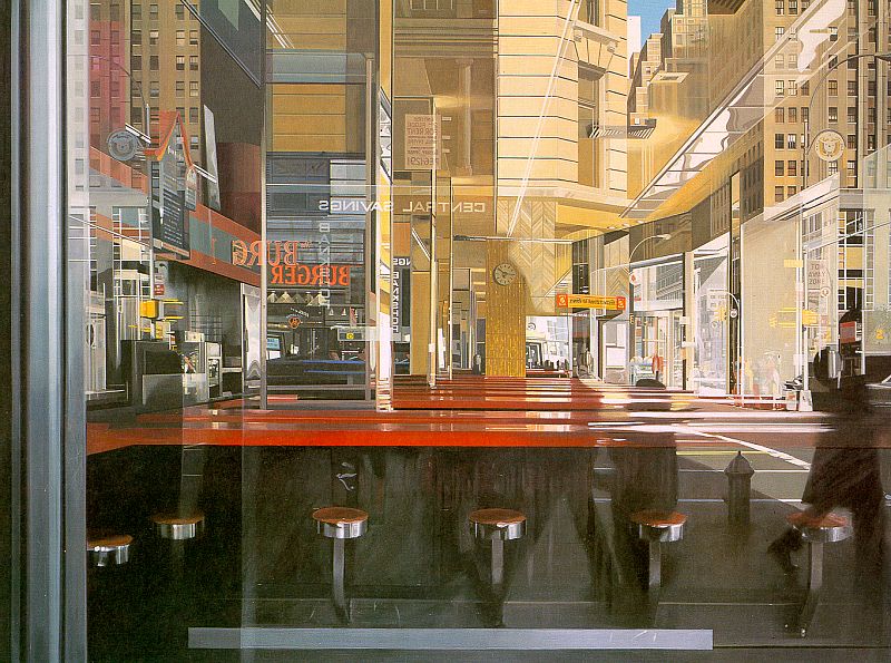 Howsabout Richard Estes? He does photorealistic paintings of urban settings, very architechtural and geometric and “masculine”. But they’re very clean-looking and modern, typically with lots of bright warm sunlight, rather than dark, gritty and foreboding. They’re also highly detailed and would make for a good conversation-starter. I’ve had a poster of “Central Savings” hanging up for many years, and I still find it fascinating to look at.