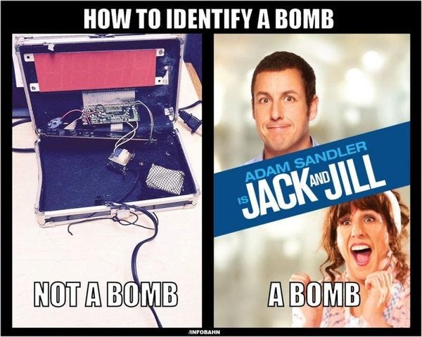 If anyone thought it had actual explosives, the logical reaction would be to get people to a place where the bomb isn’t. And the reaction from the police would be to send in the bomb fighting robot drone dogs to spray it with Bomb-B-Gone rather than all sitting around it for hours on end.