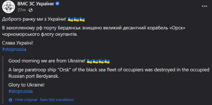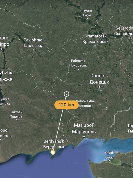 I’m not sure how the Ukrainians could have done it. It’s deep into enemy-“controlled” territory on the Sea of Azov, around which the only remaining Ukrainian-controlled area is Mariupol, up the coast, which is obviously besieged.