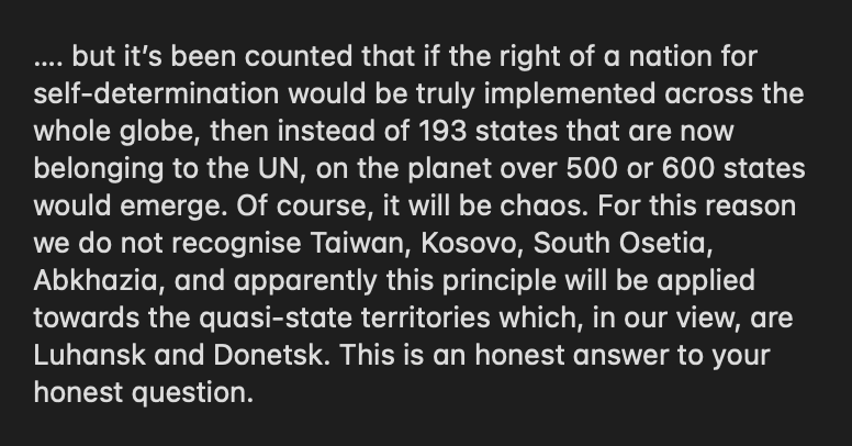 Can you explain that to a tired person? Is he saying that a nation’s self determination of wanting to take back land conflicts with the integrity of an established nation?