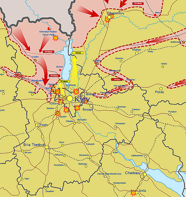 Ukraine now seems to be launching attacks on the Russian column approaching Kyiv from the east, and their long supply line.