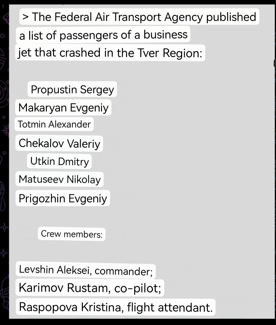 Wagner has two jets, RA02795 and RA02748. RA02795 is the one that crashed and the passenger manifest includes not only Prigozhin, but also Dmitry Utkin, who was a founder of Wagner.