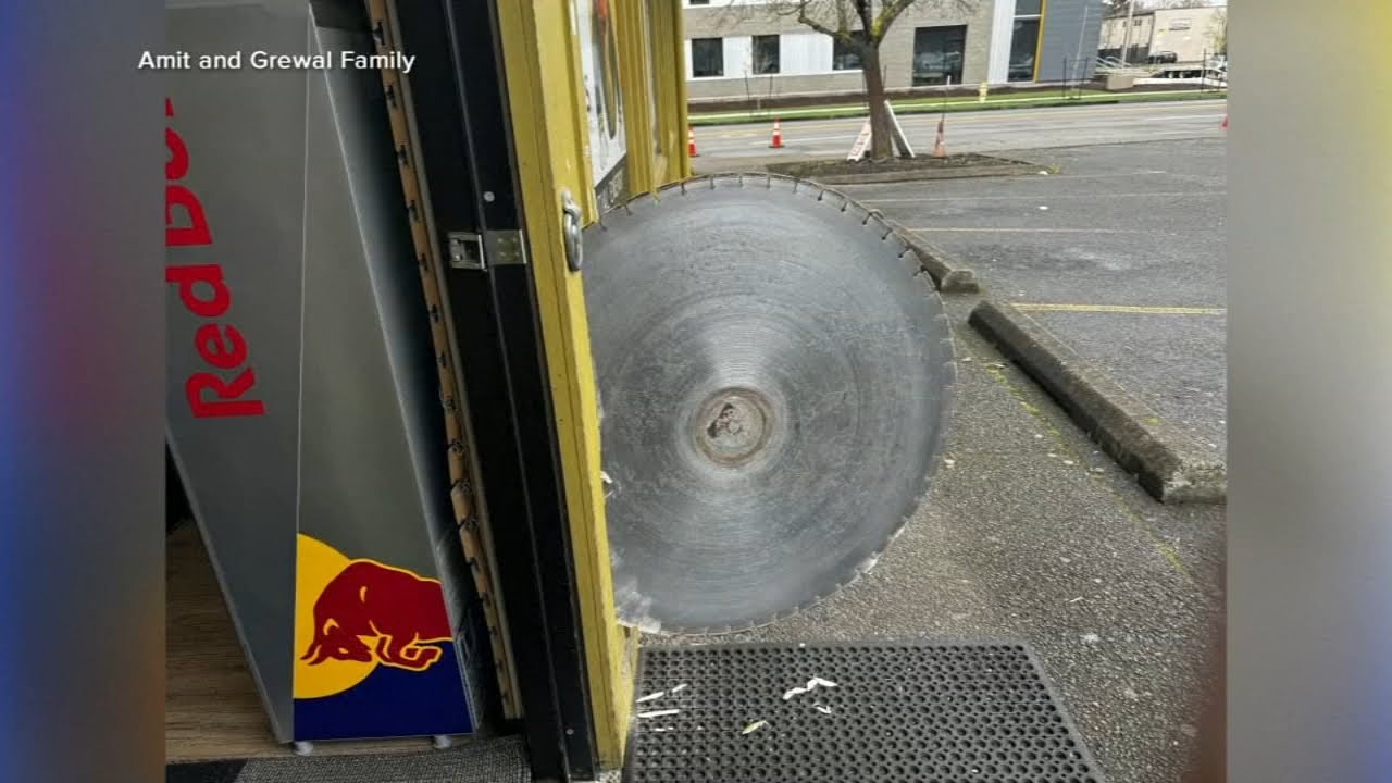Guy enters store. Shortly after, an errant Sawblade hits store. Looks to me like a concrete cutting saw.