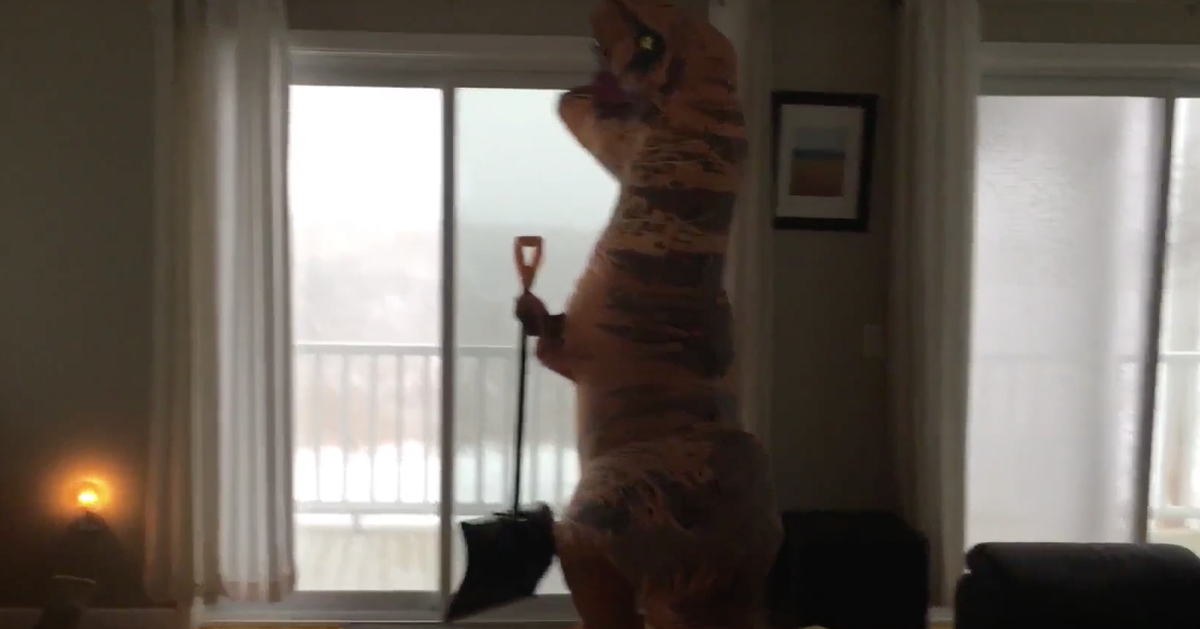 Apparently, while you can get married in a T. Rex suit, it’s not a good idea to shovel snow while wearing one: