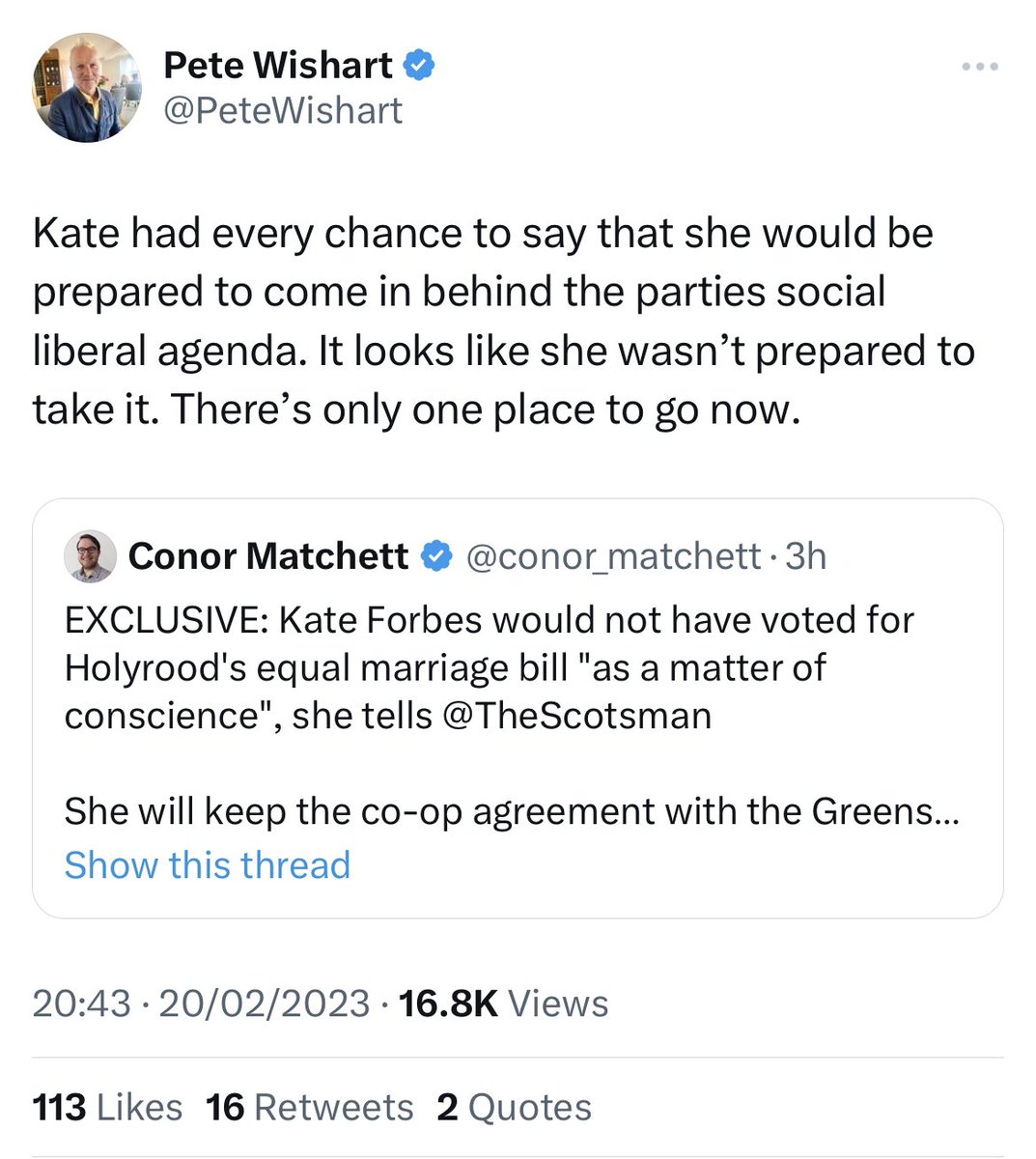 Coupled with the fact that there’s obviously no successor in place, it really looks like Sturgeon has thrown her party a hospital pass. She is generally tactically astute but the more I think about the haste of her resignation, the more it seems like she really, really just wanted to get out.