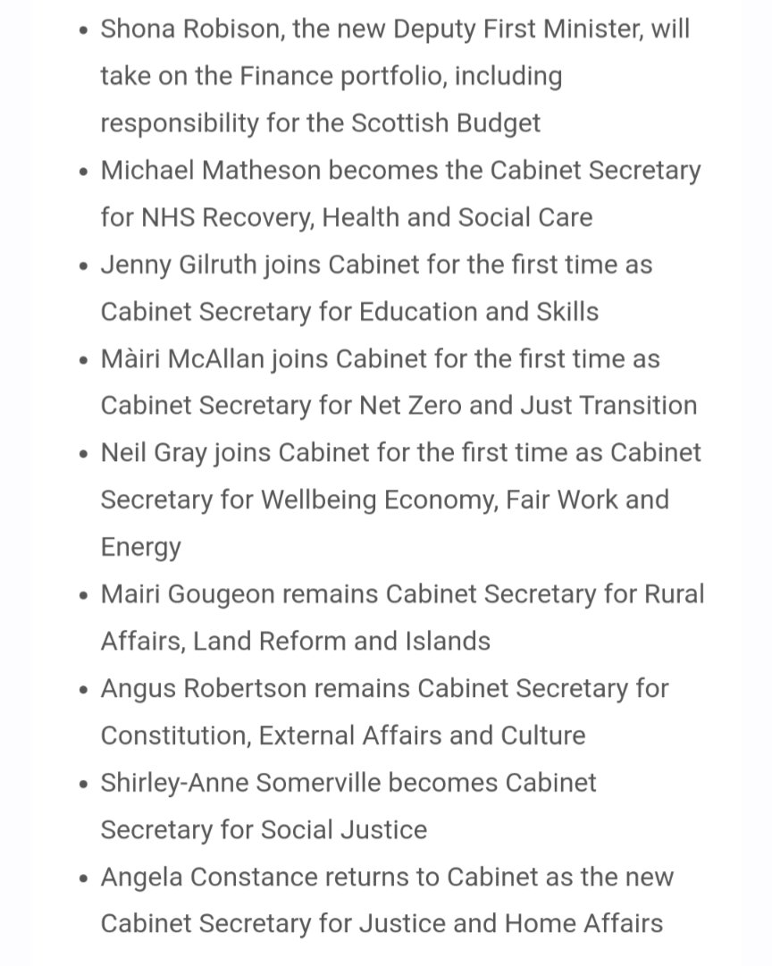His first appointment was Deputy First Minister* for whom he picked Shona Robison - an old friend of Sturgeon’s, a former Health Secretary (widely held to have resigned before she had to be fired) and former Cabinet Secretary for Social Justice, in which role she steered the GRR through Holyrood.