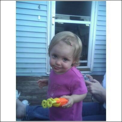 The last one is from this past Saturday on our deck. She usually cringes when she sees a camera, so my nephew used his camera phone to get this shot. The weird angle makes her look like either a midget or a dinosaur, but it’s a cute, goofy shot.