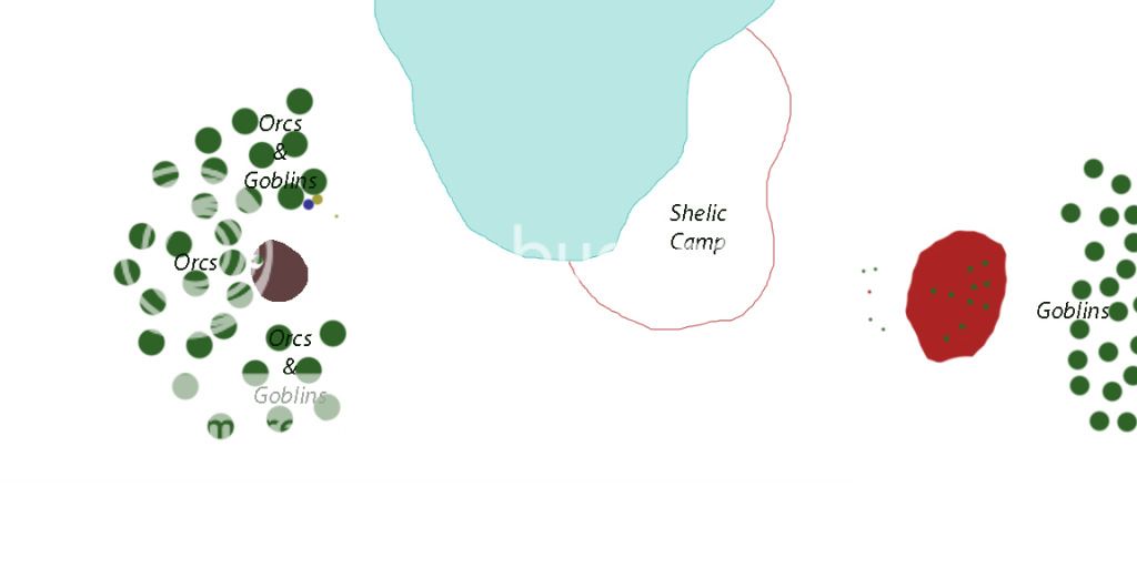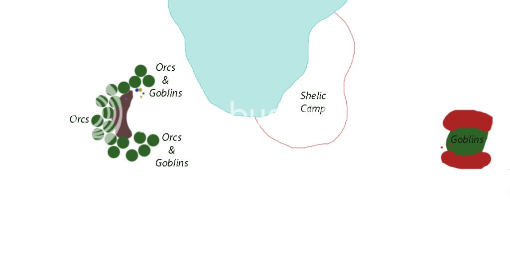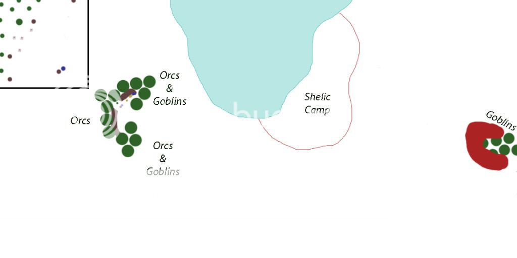 Here is a simple map to give an idea of the battle thus-far. It’s not drawn to any precise scale of distances or the like, it exists merely to provide a visual. Dwarven forces are brown on the map, Yellow Suns are yellow, Hadburgs are blue, Shelic are red and the greenskins are, of course, green.